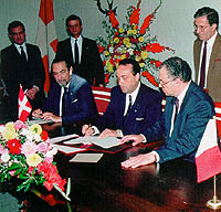 Valletta. Malta.La firma dell'accordo tra il Governo della Repubblica di Malta e il Sovrano Ordine per la concessione in uso esclusivo di Forte Sant'Angelo, il 21 giugno 1991. L'Amb. Conte Don Carlo Marullo di Condojanni, mentre sottoscrive il protocollo; alla sua sinistra il Presidente della Repubblica di Malta, Ugo Mifsud Bonnici, all'epoca Ministro dell'Educazione e dell'Interno; alla sua destra l'Ambasciatore dell'Ordine a Malta, Dino Marrajeni. |
