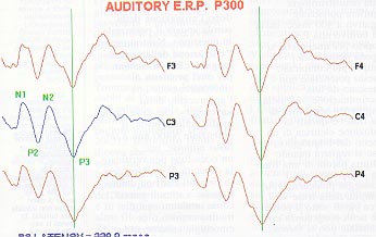 Right and left, typical P300 potentials (in this case with latency of 339 msec), registered by four zones of the two hemispheres. The vertical bars provide an immediate reading of the latency of the desired peak.