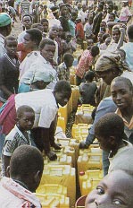 Zaire. The Order's humanitarian work for the Rwandese population, in the refugee camps set up in Zaire along the border with Rwanda, where thousands found shelter during their exodus from the lands devastated by civil war. In the photo, the distribution of drinking water from the purification plants installed by the German Relief Corps (MHD).